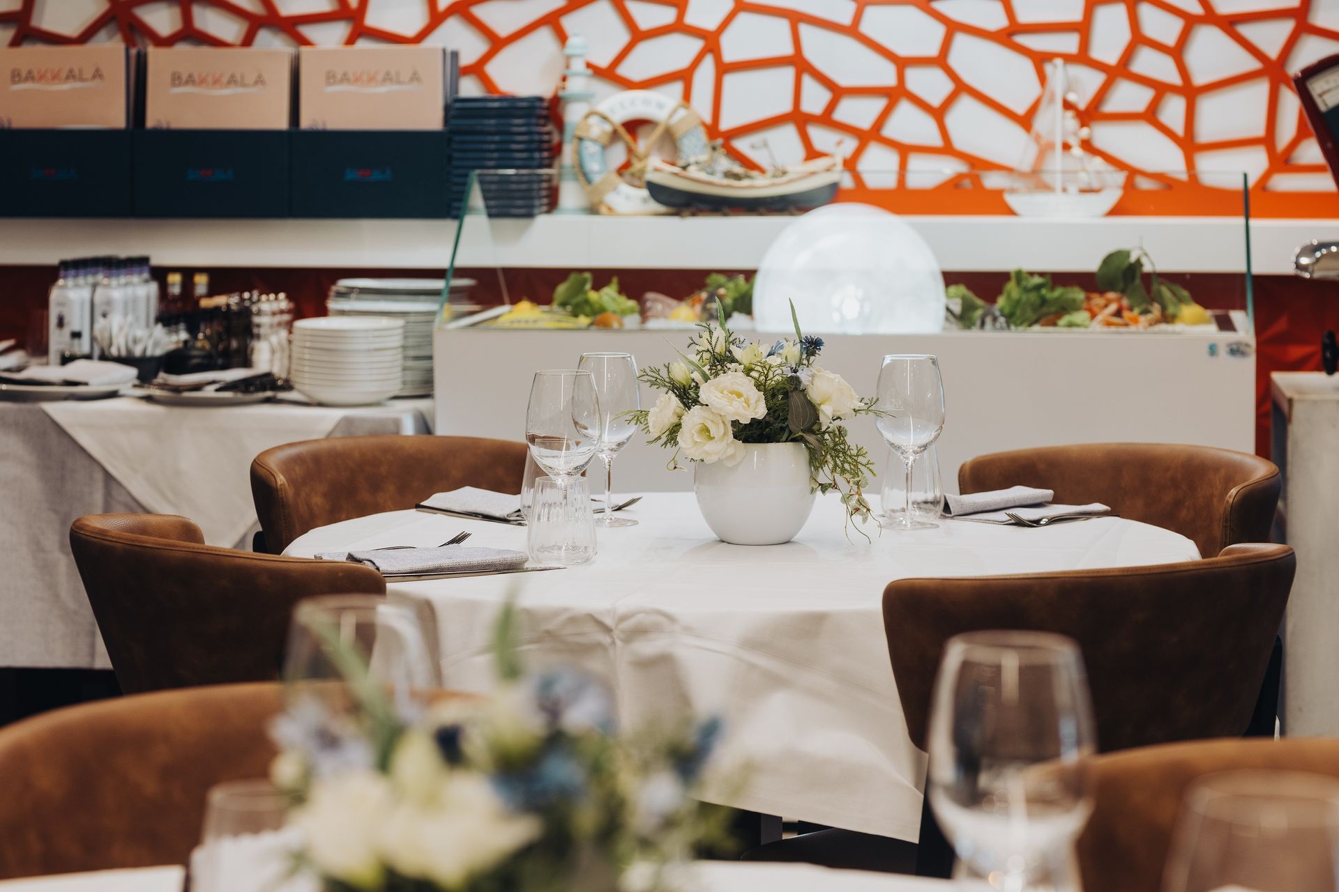Il ristorante propone cucina mediterranea con squisite specialità di pesce, antipasti di mare, primi piatti a base di pesce e suo pezzo forte sono le cruditè. Bakkalà accoglie i clienti in un ambiente moderno, confortevole e dotato di aria condizionata. Il locale, inoltre, propone un menù a prezzo fisso per il pranzo e un menù alla cena.