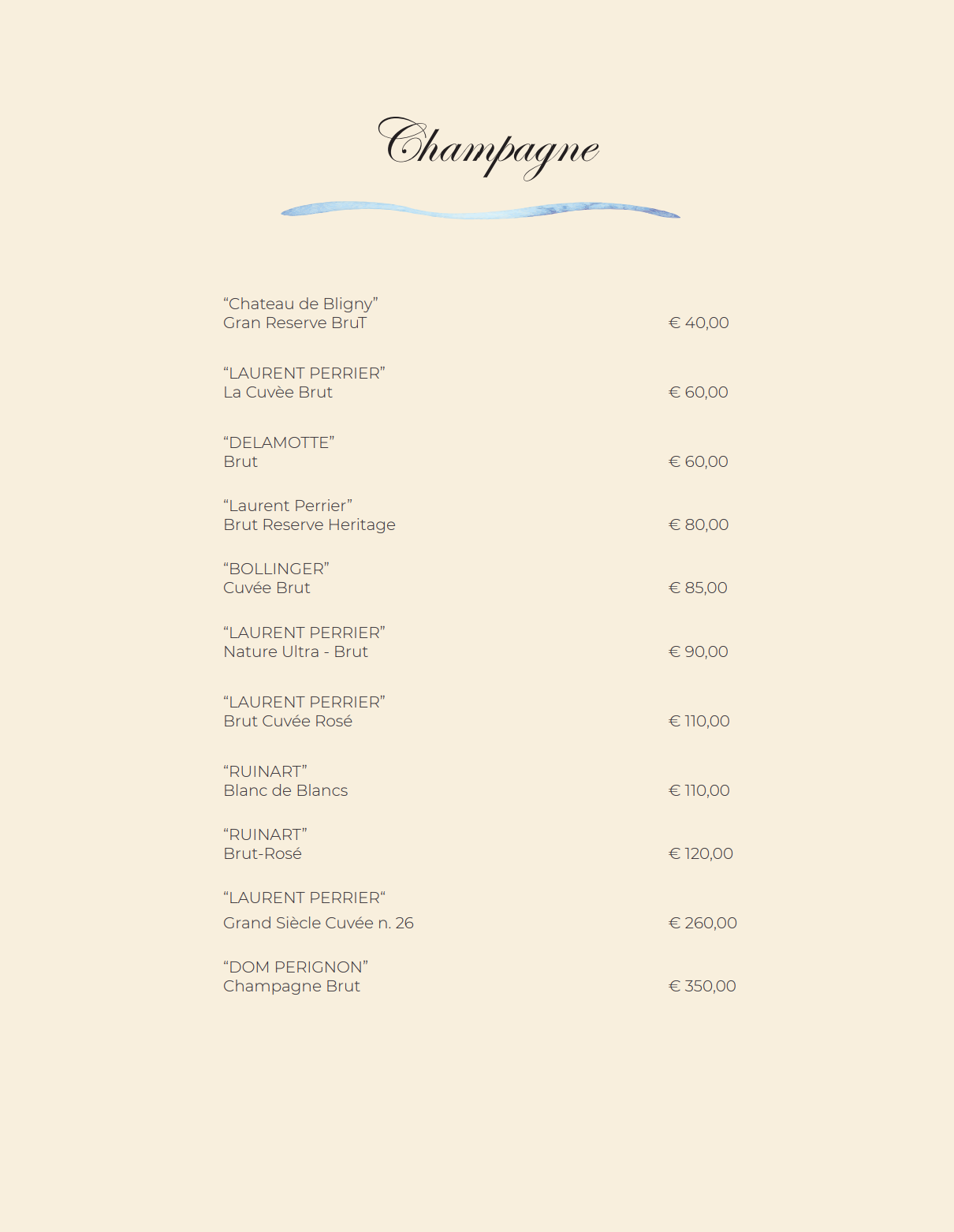 La scelta dei vini è stata fatta con estrema attenzione per permettere di creare abbinamenti unici e soddisfare i gusti e le preferenze di tutta la clientela, con proposte che vanno da quelle più note e a buon prezzo fino a quelle più pregiate e costose.